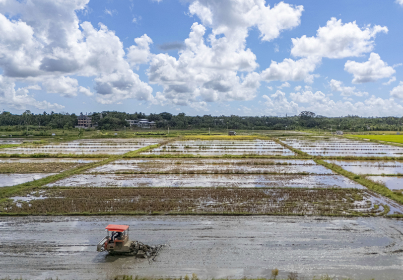 9月4日,海南省琼海市农机手在龙寿洋田野公园耕作(无人机照片)。白露节气将至,各地加强田间管理,农田里一派繁忙景象。新华社发(蒙钟德 摄)